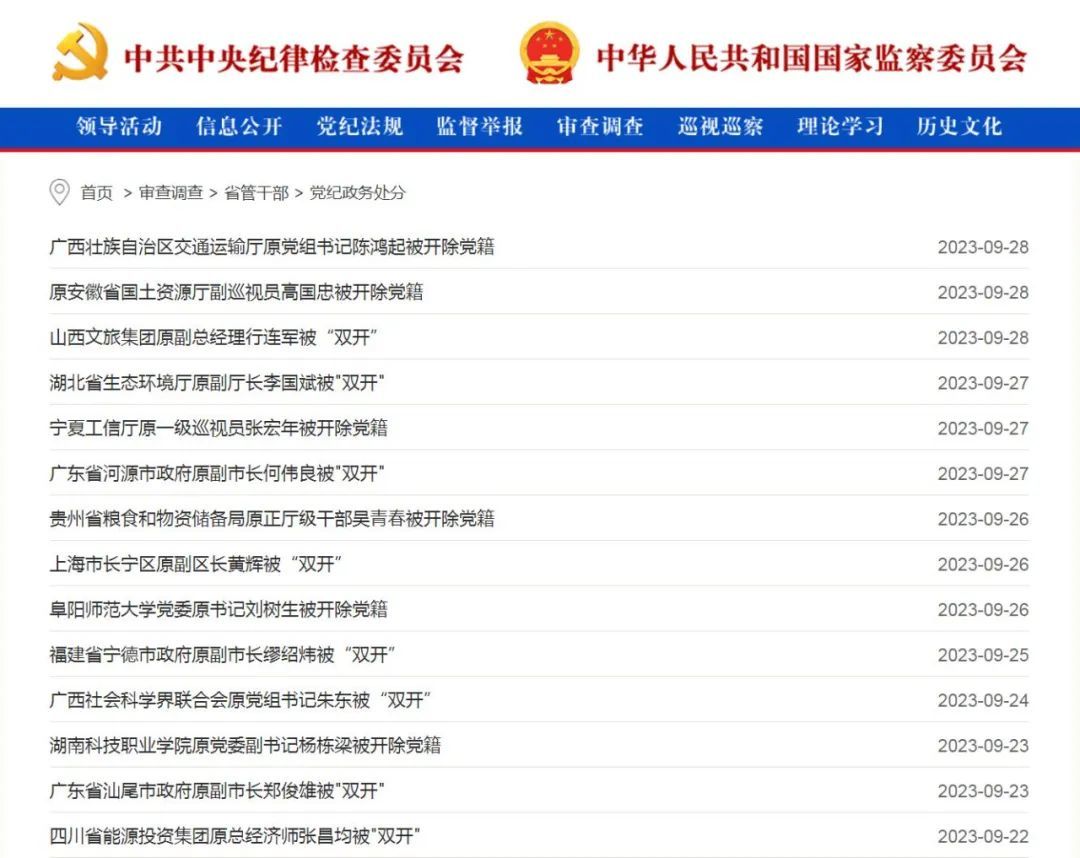 海关总署口岸监管司原副司长窦树龙被开除党籍和公职◈◈;广西壮族自治区交通运输厅原党组书记陈鸿起被开除党籍◈◈;上海市长宁区原副区长◈◈、市公安局长宁分局原党委书记◈◈、局长黄辉被开除党籍和公职◈◈,等等◈◈。